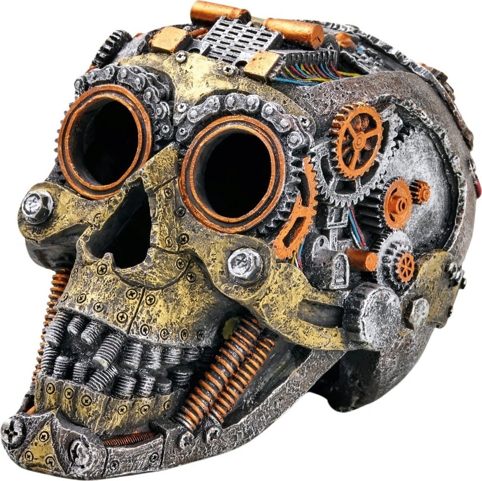 Mit diesem Steampunk Totenkopf von Eden zieht dein Aquarium bestimmt alle Blicke auf sich! Mit den vielen Details aus Zahnrädern, Schrauben und mechanischen Elementen macht er nicht nur als Dekoelement richtig was her, sondern bietet den Fischen zudem auch tolle Versteckmöglichkeiten.