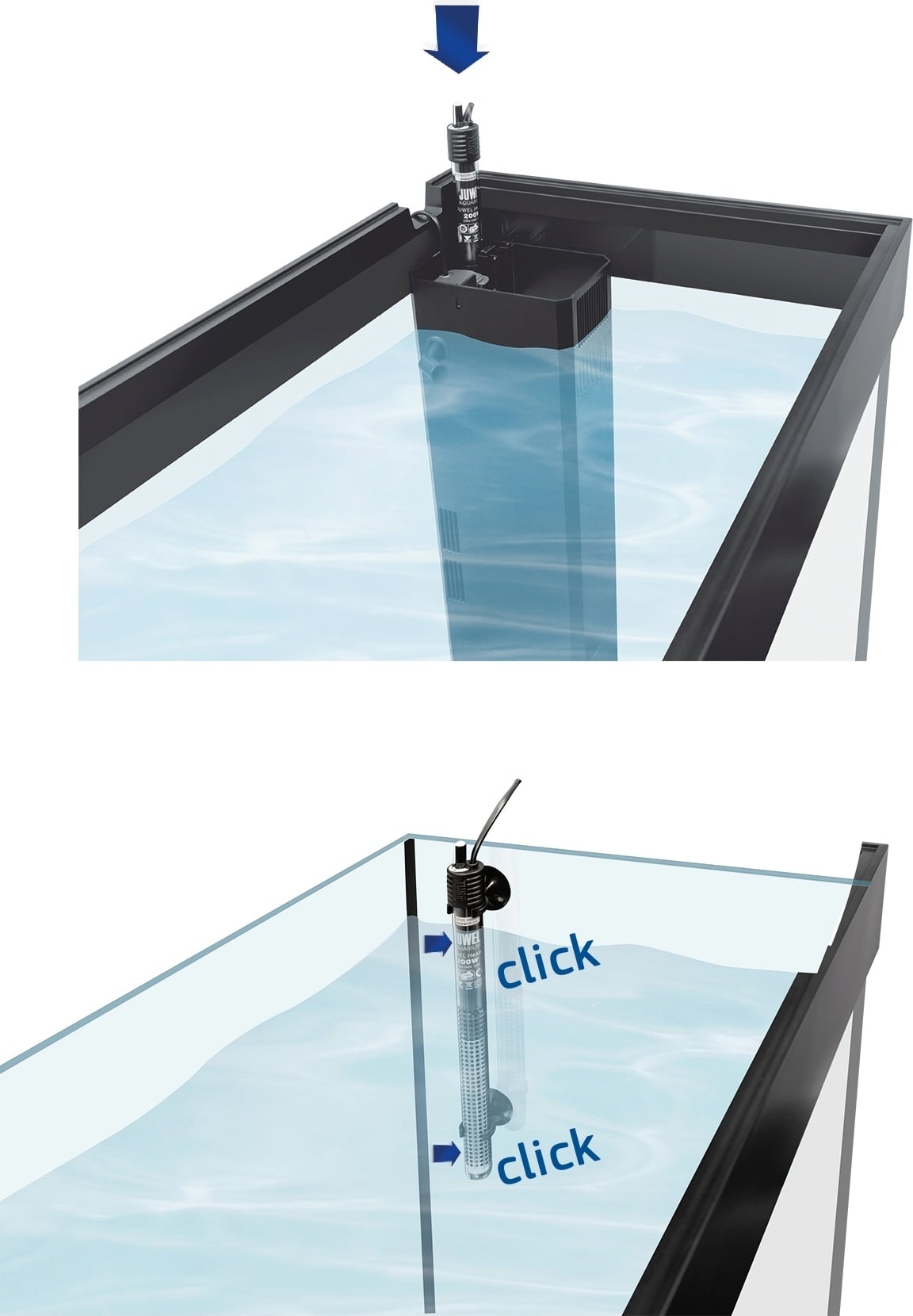 In den Modellen Rio, Vision, Trigon, Lido und Primo ist der Heizer unsichtbar im Filtergehäuse platziert und optimal im Wasserkreislauf des Bioflow Filtersystems integriert. Dies gewährleistet eine gleichmäßige und effiziente Wärmeverteilung in deinem Aquarium.