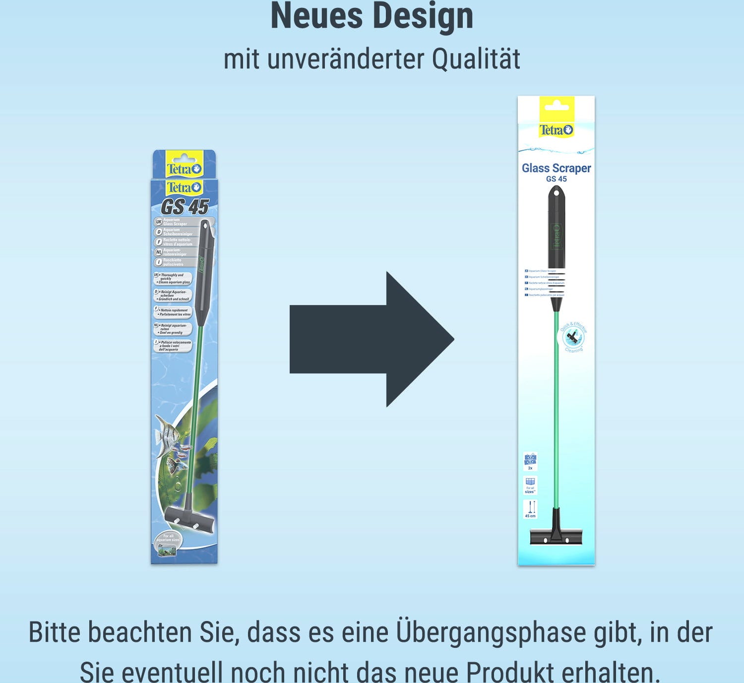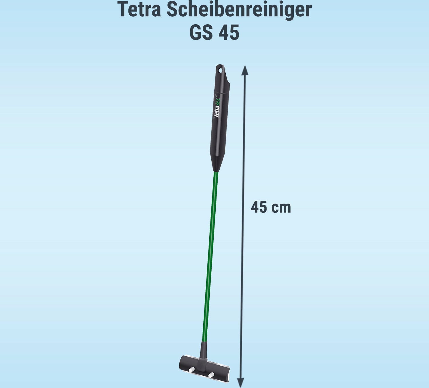 Zur optimalen Aquarienpflege zählt auch das regelmäßige Reinigen der Aquarienscheiben. Algen und andere Beläge setzen sich an den Innenseiten der Scheiben ab und werden mit der Zeit unansehnlich. Um wieder einen ungetrübten Blick auf Ihre wertvollen Fische und Pflanzen zu gewährleisten, sollten Sie die Scheiben regelmäßig und professionell reinigen, ohne, dass diese dabei Schaden erleiden. Mit dem Tetra GS 45 Aquarien-Scheibenreiniger hält Tetra ein professionelles Werkzeug bereit, das dieser Aufgabe gewachsen ist: der 45 cm lange bruchfeste Glasfaserstab verfügt über einen stabilen Kunststoffgriff mit Aufhängeöse und einem rostfreien Klingenhalter, mit dem Sie mühelos Algen, Kalkränder und andere Schmutzpartikel effektiv und zügig entfernen können, ohne dabei nasse Hände zu bekommen. Der geschützte seitliche Klingenrand verhindert ein Einschneiden in die Silikonverklebung des Aquariums. Das Gelenkteil des Klingenhalters passt sich beim Reinigen jedem Andruckwinkel an. Die weiße Klingenhalterung ermöglicht eine Kontrolle der bereits gereinigten Flächen. Alle Klingen sind rostfrei und problemlos austauschbar, eine Ersatzklinge liegt dem Scheibenreiniger bei. Dank der schmalen Klinge erreichen Sie auch die Schmutzkante an der Kiesschicht, deren Reinigung mit einem magnetischem Scheibenreiniger zur schwer zu bewerkstelligen ist und Gefahr läuft, dass Kiessteine die Scheibe zerkratzen könnten.